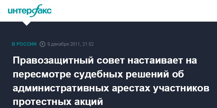 Москва. 9 декабря. INTERFAX.RU - Президентский совет по правам человека требует пересмотра судебных решений об арестах участников мирных акций протеста против итогов парламентских выборов и считает недопустимым применение к ним силы.