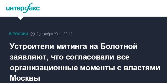 В частности, по ее словам, в ходе переговоров с представителями столичного правительства была достигнута договоренность о проведении митинга на Болотной площади с 14:00 до 18:00 численностью до 30 тыс. человек.