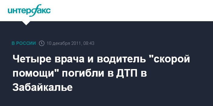 Чита. 10 декабря. ИНТЕРФАКС-СИБИРЬ - Пятеро человек, в том числе четверо врачей "скорой помощи", погибли в результате ДТП под Читой, сообщает в субботу пресс-служба УГИБДД Забайкальского края.