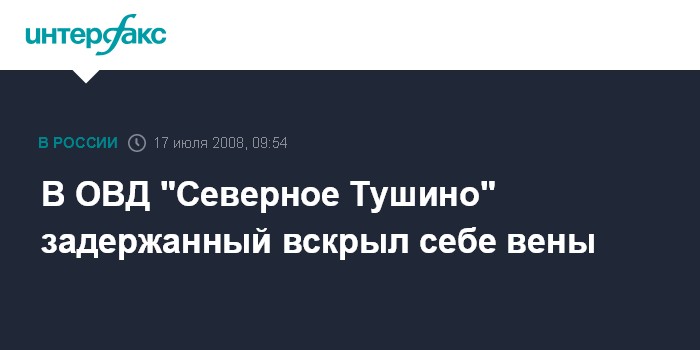 Москва. 17 июля. INTERFAX.RU - В камере для содержания задержанных отделения внутренних дел "Северное Тушино" мужчина вскрыл себе вены, сообщил "Интерфаксу" источник в правоохранительных органах столицы.