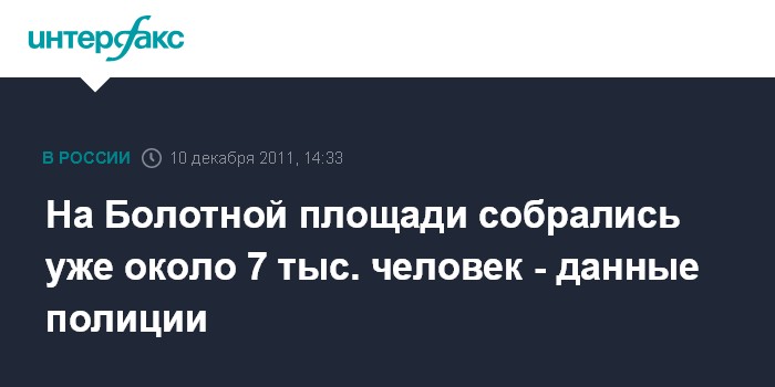 Москва. 10 декабря. INTERFAX. RU - Около 7 тыс. человек собрались на Болотной площади перед началом общественно-массового мероприятия, сообщили журналистам в пресс-службе ГУ МВД России по Москве. "На Болотной площади собралось около 7 тыс. человек, количество представителей СМИ среди них достигает 1 тыс. человек", - сказали в пресс-службе.