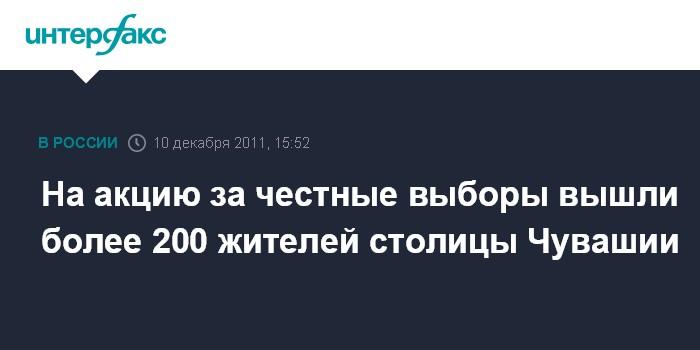Чебоксары. 10 декабря. INTERFAX.RU - Санкционированная властями акция протеста против фальсификации результатов выборов в Чебоксарах (Чувашия) в субботу собрала более 200 человек, сообщает корреспондент агентства "Интерфакс-Поволжье". Участники стоят с плакатами, скандируют: "Даешь честные выборы!", "Свободу политзаключенным!"