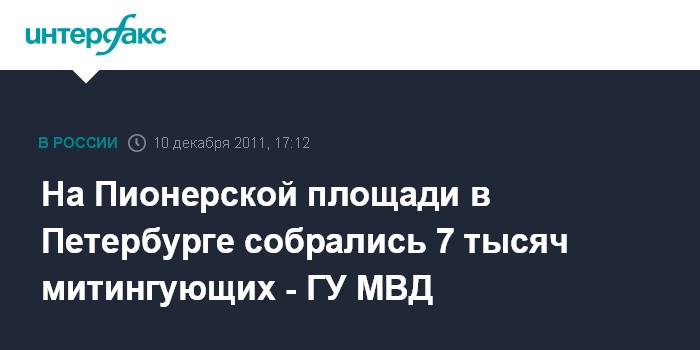 Санкт-Петербург. 10 декабря. INTERFAX.RU - По данным петербургской полиции, на Пионерской площади в субботу на акцию протеста против нарушений на выборах собрались около 7 тыс. митингующих.