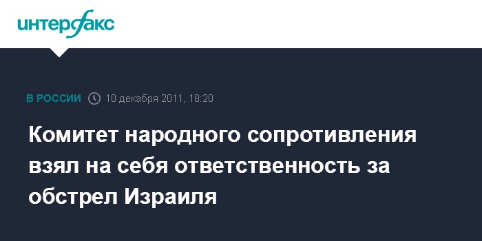 Иерусалим. 10 декабря. INTERFAX.RU - Ответственность за ракетный обстрел юга Израиля, произведенный палестинцами в пятницу и субботу утром, взяло на себя военное крыло организации Комитета народного сопротивления, которая базируется в секторе Газа, сообщили израильские СМИ. Ранее предполагалось, что за ракетным обстрелом Израиля может стоять ХАМАС.