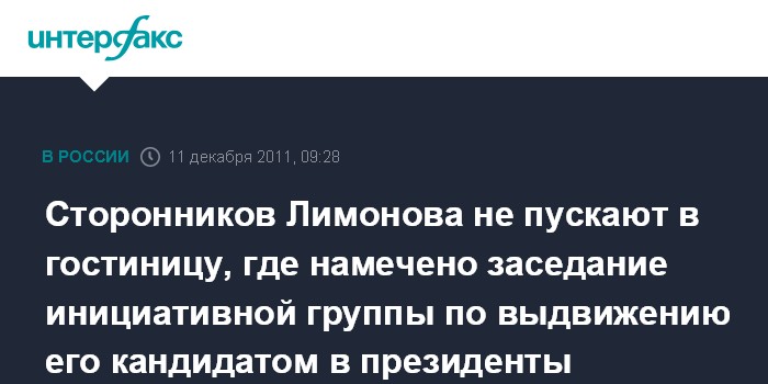 Москва. 11 декабря. ИНТЕРФАКС - Инициативной группе по выдвижению оппозиционера и писателя Эдуарда Лимонова кандидатом на должность президента РФ препятствуют в проведении собрания.