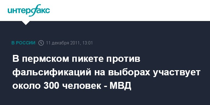 Пермь. 11 декабря. INTERFAX.RU - В Перми напротив гостиницы "Урал" начался санкционированный пикет несогласных с итогами выборов. "По нашим данным, сейчас на месте собрались примерно 300 человек. В охране порядка этого мероприятия участвуют около 200 сотрудников полиции и сотня солдат. Пока нарушений зафиксировано не было", - сообщил агентству "Интерфакс-Поволжье" представитель ГУ МВД по Пермскому краю.