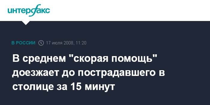 Москва. 17 июля. INTERFAX.RU - "Скорой помощи" в столице в среднем требуется четверть часа, чтобы доехать до пострадавшего, сообщил "Интерфаксу" главный терапевт Москвы Леонид Лазебник.