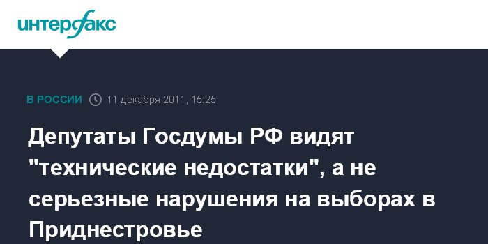 Тирасполь. 11 декабря. INTERFAX.RU - Наблюдатели от России - депутаты Государственной думы Российской Федерации пока не увидели существенных нарушений на выборах президента непризнанной Приднестровской Молдавской Республики, проходящих в воскресенье.