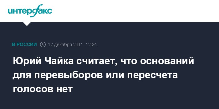 "Считаю, что никаких оснований для назначения перевыборов или пересчета голосов по результатам голосования нет", - сказал генпрокурор, комментируя по просьбе "Интерфакса" призывы оппозиционных сил отменить результаты выборов в связи с выявленными нарушениями.