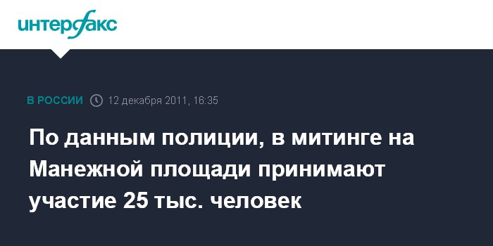 Москва. 12 декабря. INTERFAX.RU - Митинг на Манежной площади в поддержку президента Дмитрия Медведева и премьера Владимира Путина собрал 25 тыс. человек, сообщили "Интерфаксу" в пресс-службе ГУ МВД по Москве.