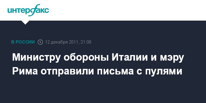 Лондон. 12 декабря. INTERFAX.RU - Полиция Италии перехватила письма, содержащие пули и угрозы, предназначенные министру юстиции страны и мэру Рима, сообщает в понедельник британская телерадиокорпорация BBC.
