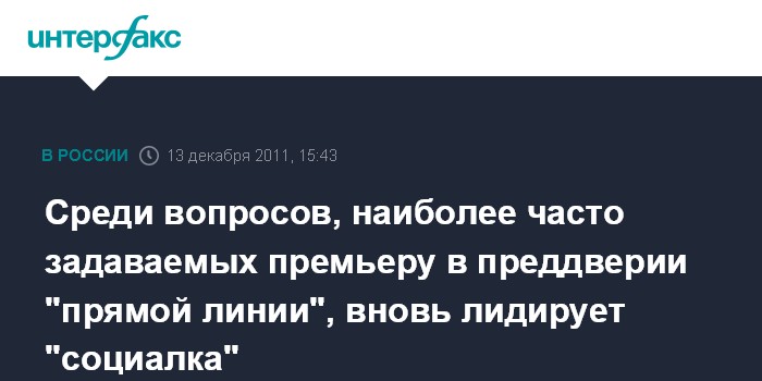 Москва. 13 декабря. INTERFAX.RU - Последние политические события в стране пока не нашли отражения в тематике вопросов, которые россияне хотели бы задать премьеру РФ Владимиру Путину в ходе очередной "прямой линии" со страной.