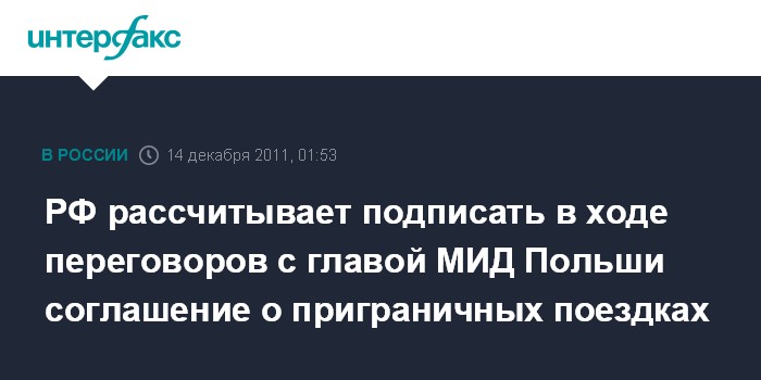 Москва. 14 декабря. ИНТЕРФАКС - Главы МИД России и Польши Сергей Лавров и Радослав Сикорский проведут переговоры в среду в Москве, во время которых подпишут соглашение, позволяющее жителям Калининградской области ездить на территорию Польши без виз.