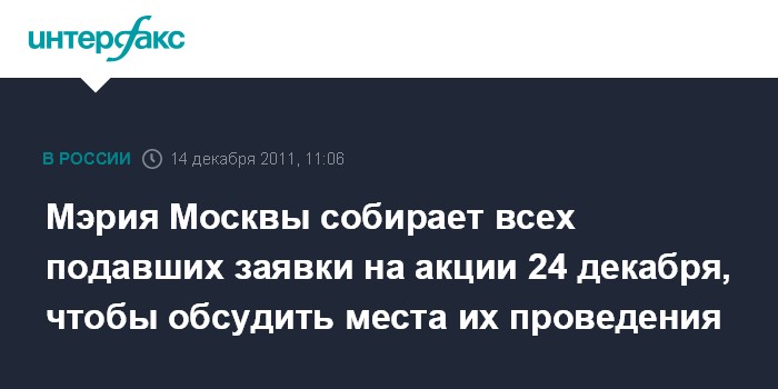 Москва. 14 декабря. INTERFAX.RU - Московские власти предлагают подавшим заявки на проведение различных акций в субботу, 24 декабря, вместе обсудить, кто и куда пойдет митинговать.