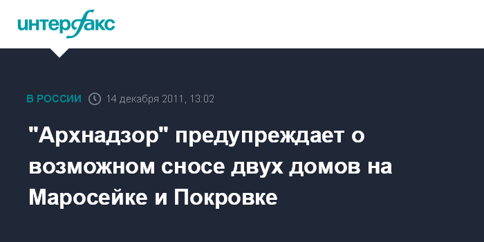 Москва. 14 декабря. INTERFAX.RU - Два исторических дома могут быть снесены в центре Москвы, сообщили "Интерфаксу" в пресс-службе движения "Архнадзор" в среду.