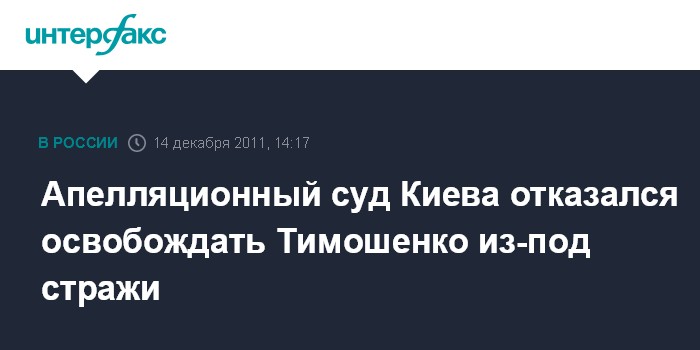 Киев. 14 декабря. INTERFAX.RU - Апелляционный суд Киева не нашел оснований для освобождения из-под стражи экс-премьера Украины Юлии Тимошенко.