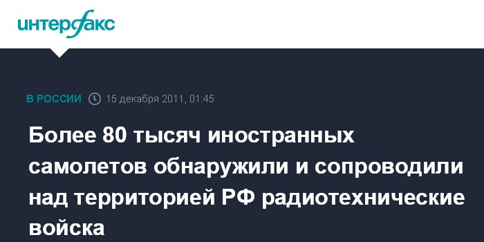 Москва. 15 декабря. ИНТЕРФАКС-АВН - Расчеты радиотехнических войск (РТВ) Военно-воздушных сил РФ (ВВС) в 2011 году обнаружили и сопроводили над воздушным пространством России более 850 тысяч воздушных судов, в том числе 81 тысячу иностранных самолетов, сообщили "Интерфакс-АВН" в управлении пресс-службы и информации Минобороны РФ.