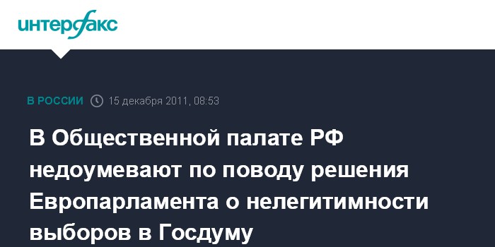 Москва. 15 декабря. INTERFAX.RU - Совет Общественной палаты РФ выражает недоумение по поводу решения Европейского парламента о нелегитимности выборов в Госдуму России и призывов к европейским институтам оказать давление на руководство России с целью отмены их результатов.