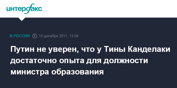 "У Тины, наверно, много талантов, но для того, что возглавлять министерство, нужно иметь и управленческий опыт, и опыт работы в соответствующей отрасли. Не уверен, что такой опыт у Тины есть", - так ответил премьер на вопрос, правда ли, что Тина Канделаки станет следующим министром образования РФ.