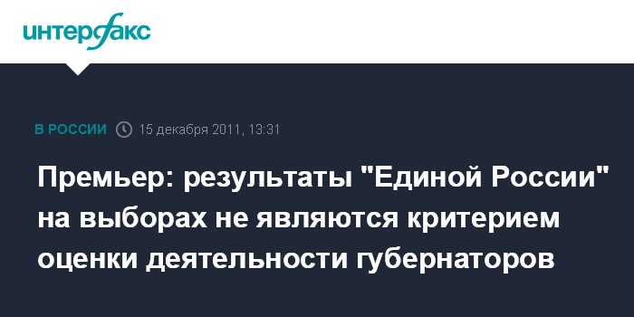 Москва. 15 декабря. INTERFAX.RU - Правительственные критерии оценки эффективности губернаторов не содержат связи с результатами "Единой России" на выборах в регионах, но в некоторых случаях губернаторам стоит подумать об отставке, заявил премьер-министр РФ Владимир Путин.