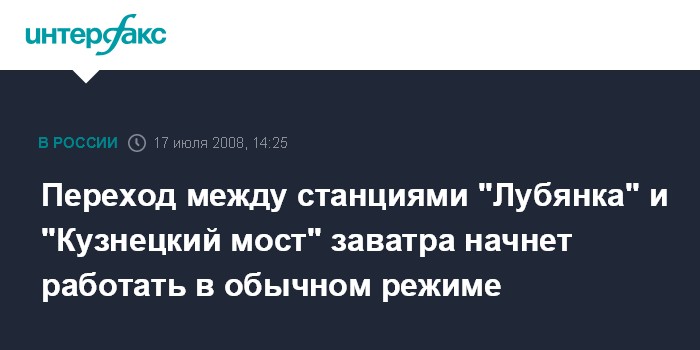 Москва. 17 июля. INTERFAX.RU - Переход между станциями столичной подземки "Лубянка" и "Кузнецкий мост" с пятницы заработает в обычном режиме, сообщил "Интерфаксу" руководитель пресс-службы метро Дмитрий Головин.