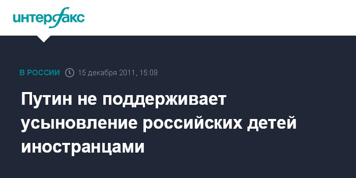 Москва. 15 декабря. INTERFAX.RU - Премьер-министр РФ Владимир Путин заявил, что он является противником усыновления российских детей иностранными семьями, и считает, что в перспективе этот процесс должен быть сведен к нулю.