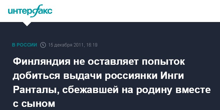 Хельсинки. 15 декабря. INTERFAX.RU - Прокуратура Финляндии требует от России выдать ее гражданку Ингу Рантала для суда над ней в связи с "избиением сына" Роберта.