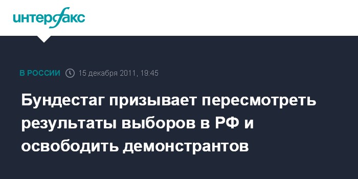 Берлин. 15 декабря. INTERFAX.RU - Депутаты Бундестага выступили в поддержку оппозиции в России и призвали пересмотреть результаты выборов в Госдуму, а также освободить задержанных манифестантов, сообщает в четверг агентство ЭФЭ.