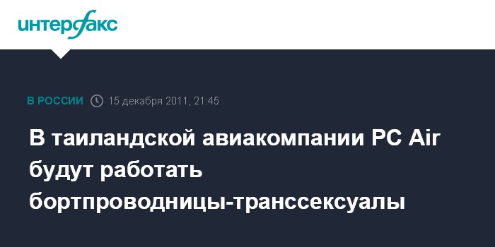 Пекин. 15 декабря. INTERFAX.RU - Новая таиландская авиакомпания PC Air наняла на работу четырех бортпроводниц-транссексуалов, сообщает в четверг китайская газета China Daily.