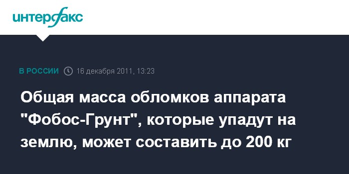 Общая масса обломков аппарата "Фобос-Грунт", которые упадут на землю, может составить до 200 кг