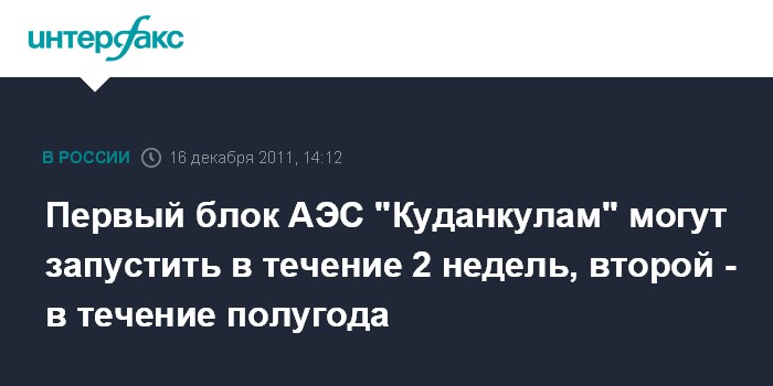 Москва. 16 декабря. INTERFAX.RU - Первый блок АЭС "Кудамкулам" может быть запущен в течение ближайших двух недель, второй - в течение следующих шести месяцев, сообщил в пятницу премьер Индии Манмонхан Сингх, отвечая на вопрос "Интерфакса".