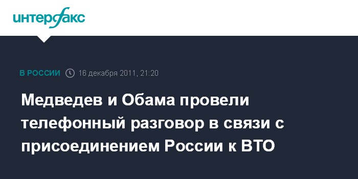 Москва. 16 декабря. INTERFAX.RU - Президент США Барак Обама позвонил в пятницу президенту России Дмитрию Медведеву и поздравил его с присоединением России к ВТО.