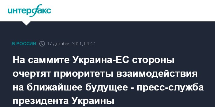 Киев. 17 декабря. ИНТЕРФАКС-УКРАИНА - В Киеве 19 декабря на саммите Украина-ЕС стороны подведут итоги сотрудничества в 2011 году и очертят приоритетные направления взаимодействия на ближайшее будущее, в частности, в контексте заключения Соглашения об ассоциации, сообщает пресс-служба президента Украины Виктора Януковича в пятницу.