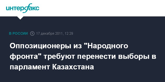 Алматы. 17 декабря. INTERFAX.RU - Оппозиционное незарегистрированное объединение "Халык майданы - Народный фронт" требует отложить проведение выборов в мажилис парламента Казахстана из-за произошедших в Жанаозене беспорядков. "Мы считаем, что в такой ситуации нужно отложить проведение парламентских выборов в мажилис Республики Казахстан", - говорится в заявлении "Народного фронта", размещенном в субботу на сайте информационно-аналитического портала "Республика".