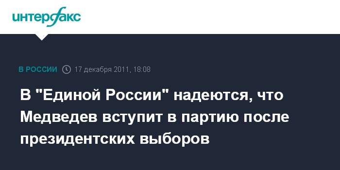 По словам В.Мединского, он спросил Д.Медведева, не готов ли президент решить вопрос о членстве в "Единой России", поскольку он был лидером списка партии на выборах в Госдуму, и единороссы в сложной ситуации показали неплохой результат. В.Мединский передал суть ответа президента: "Д.Медведев еще раз подчеркнул, что каждый руководитель партии должен быть ее членом".