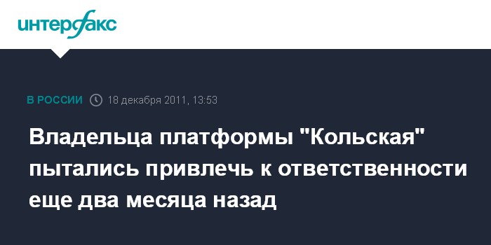 Москва. 18 декабря. INTERFAX.RU - Отдел Росприроднадзора по надзору на море по Камчатскому краю и Чукотскому АО еще в октябре 2011 года пытался привлечь владельца утонувшей в ночь на 18 декабря платформы "Кольская" - государственную компанию "Арктикморнефтегазразведка" - к административной ответственности.