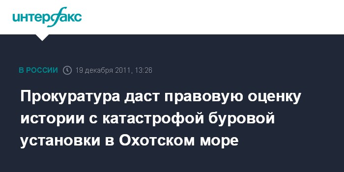 Москва. 19 декабря. INTERFAX.RU - Генеральная прокуратура РФ взяла на контроль ситуацию, связанную с катастрофой буровой установки "Кольская", затонувшей в минувшее воскресенье в Охотском море.