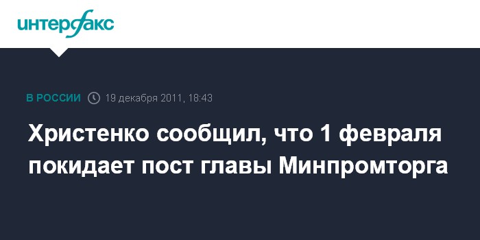 Москва. 19 декабря. INTERFAX.RU - Глава Минпромторга России Виктор Христенко покинет свой пост 1 февраля будущего года в связи с назначением на должность председателя коллегии евразийской экономической комиссии.