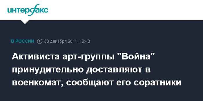 Москва. 20 декабря. INTERFAX.RU - Сотрудники правоохранительных органов задержали активиста арт-группы "Война" Петра Верзилова и везут его в военкомат.