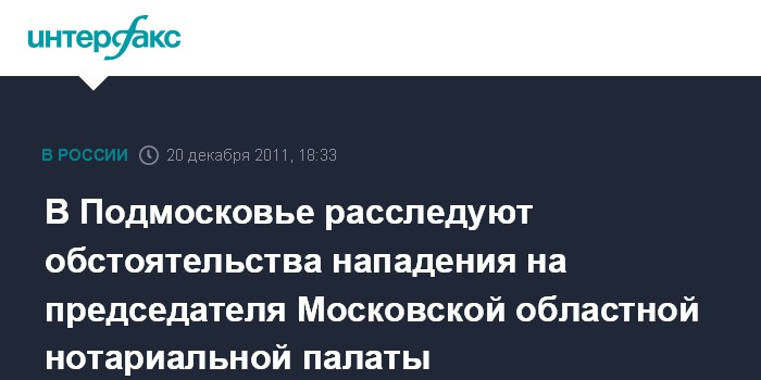 Москва. 20 декабря. INTERFAX.RU - Покушение на убийство главы Московской областной нотариальной палаты совершено во вторник в Балашихе, возбуждено уголовное дело.