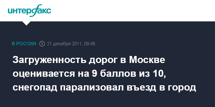 Москва. 21 декабря. INTERFAX.RU – Дорожная ситуация в среду утром в столице осложнилась: согласно показаниям аналитического сервиса "Яндекс.Пробки" на 9:35 мск пробки в городе оцениваются на 9 баллов из 10 возможных, что характеризуется сервисом как "город стоит".