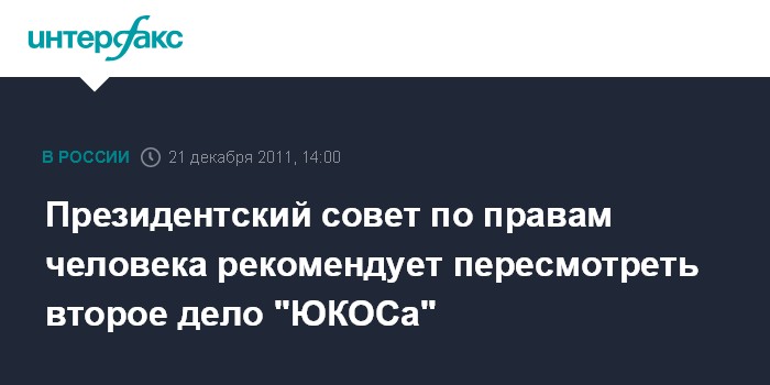 Москва. 21 декабря. INTERFAX.RU - Президентский совет по правам человека предлагает Следственному комитету изучить основания для пересмотра второго уголовного дела по "ЮКОСу".