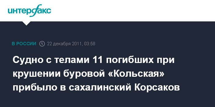 Владивосток. 22 декабря. ИНТЕРФАКС-ДАЛЬНИЙ ВОСТОК - Судно "Смит Сахалин" с телами 11 погибших с буровой "Кольская" из Охотского моря прибыл в Корсаков утром в четверг.