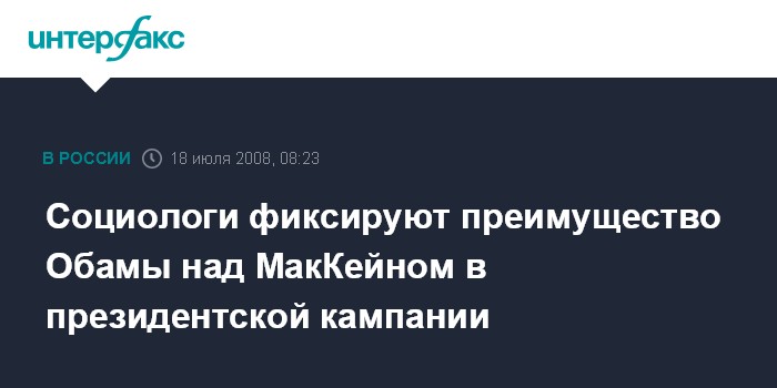 Москва. 18 июля. INTERFAX.RU - Очередной индекс социологической службы Зогби показал преимущество в 6% кандидата в президенты США от демократической партии Барака Обамы над его республиканским соперником Джоном МакКейном.