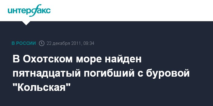Хабаровск. 22 декабря. INTERFAX.RU - На месте крушения буровой "Кольская" в Охотском море обнаружили 15-го погибшего, его тело поднято на буксир "Атлас".