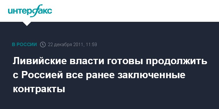 Москва. 22 декабря. INTERFAX.RU - Ливийские власти подтвердили готовность продолжить сотрудничество с российскими компаниями по всем заключенным ранее контрактам и действующим проектам, сообщил спецпредставитель президента РФ по Африке сенатор Михаил Маргелов.