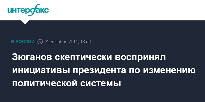На вопрос, есть ли, по его мнению, будущее у политической реформы, предложенной Дмитрием Медведевым, Зюганов пояснил: "Вы увидите, что команда Путина ничего похожего не допустит. Уже сегодня ставится задача победить на (президентских - ИФ) выборах с результатом под 60%, а это, как показали думские выборы, невозможно".