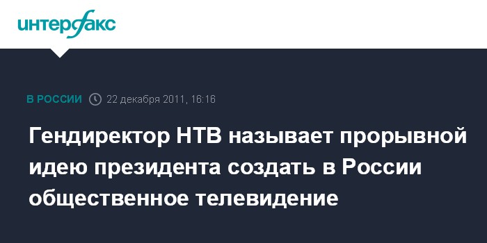 Москва. 22 декабря. INTERFAX.RU - Гендиректор НТВ Владимир Кулистиков поддержал идею создания общественного телевидения, предложенную президентом России Дмитрием Медведевым.
