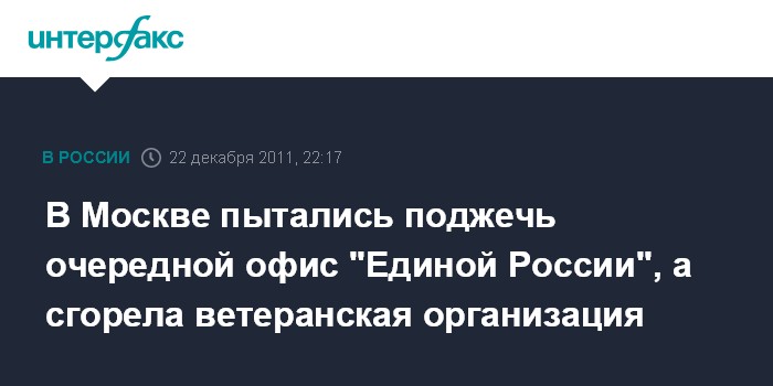Москва. 22 декабря. INTERFAX.RU - Видеозапись, на которой демонстрируется поджог одного из офисов партии "Единая Россия", появилась в интернете. Между тем источники сообщают, что хулиганы ошиблись офисом и подожгли находящуюся в соседнем помещении ветеранскую организацию.