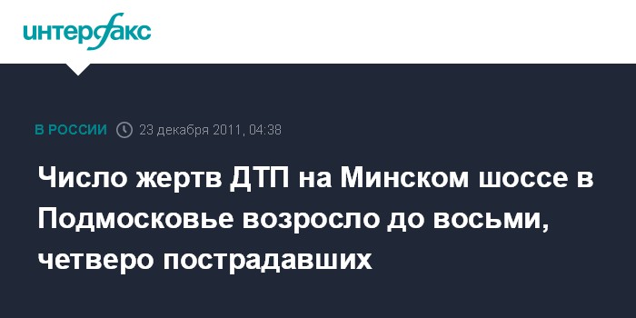Москва. 23 декабря. ИНТЕРФАКС - Количество погибших в результате ДТП на 125 км Минского шоссе в районе Бородино возросло до восьми человек, сообщили "Интерфаксу" в пресс-службе ГИБДД по Московской области.
